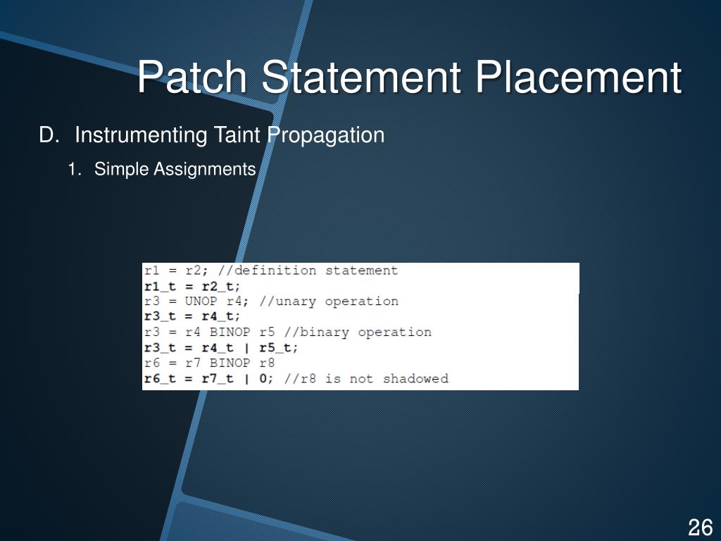 Instrumenting Taint Propagation • Simple Assignments Patch Statement Placement