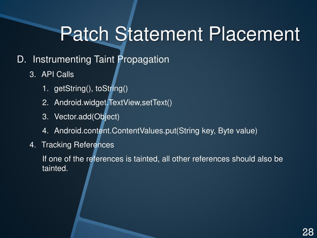 Instrumenting Taint Propagation • API Calls • getString(), toString() • Android.widget.TextView,setText() • Vector.add(Object) • Android.content.ContentValues.put(String key, Byte value) • Tracking References If one of the references is tainted, all other references should also be tainted. Patch Statement Placement