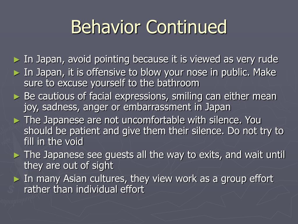 Behavior Continued • In Japan, avoid pointing because it is viewed as very rude • In Japan, it is offensive to blow your nose in public. Make sure to excuse yourself to the bathroom • Be cautious of facial expressions, smiling can either mean joy, sadness, anger or embarrassment in Japan • The Japanese are not uncomfortable with silence. You should be patient and give them their silence. Do not try to fill in the void • The Japanese see guests all the way to exits, and wait until they are out of sight • In many Asian cultures, they view work as a group effort rather than individual effort