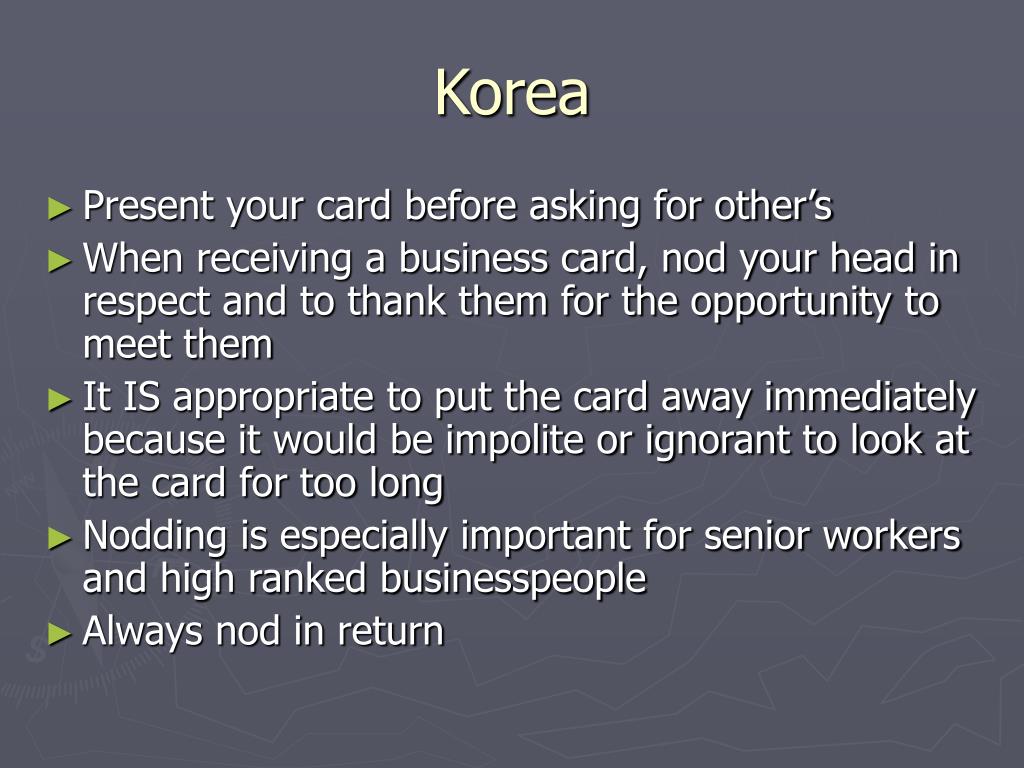 Korea • Present your card before asking for other’s • When receiving a business card, nod your head in respect and to thank them for the opportunity to meet them • It IS appropriate to put the card away immediately because it would be impolite or ignorant to look at the card for too long • Nodding is especially important for senior workers and high ranked businesspeople • Always nod in return