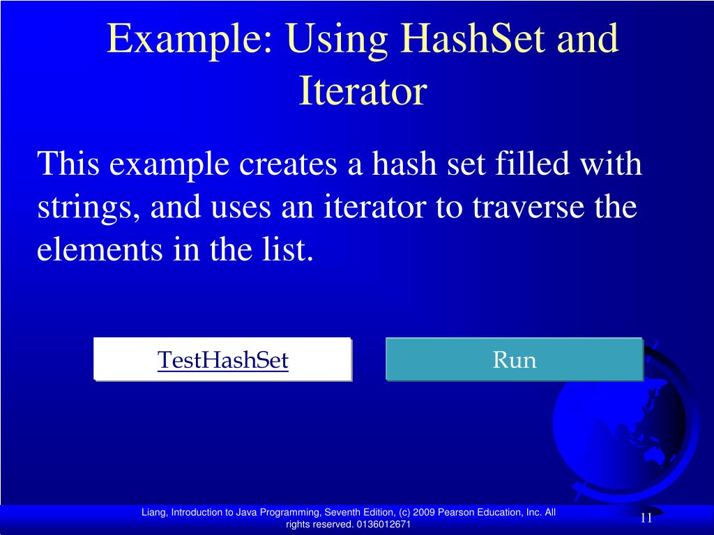 Example: Using HashSet and Iterator This example creates a hash set filled with strings, and uses an iterator to traverse the elements in the list. TestHashSet Run