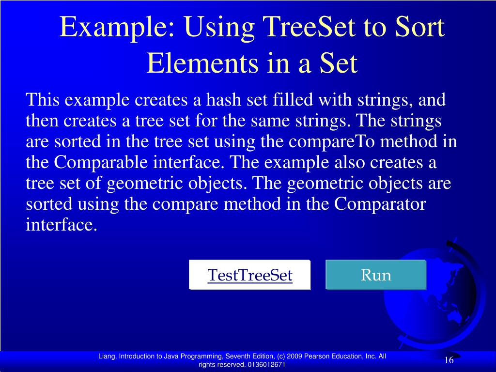 Example: Using TreeSet to Sort Elements in a Set This example creates a hash set filled with strings, and then creates a tree set for the same strings. The strings are sorted in the tree set using the compareTo method in the Comparable interface. The example also creates a tree set of geometric objects. The geometric objects are sorted using the compare method in the Comparator interface. TestTreeSet Run
