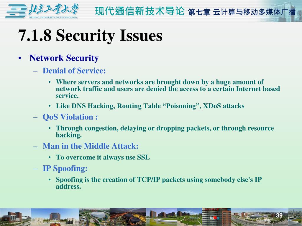 7.1.8 Security Issues • Network Security • Denial of Service: • Where servers and networks are brought down by a huge amount of network traffic and users are denied the access to a certain Internet based service. • Like DNS Hacking, Routing Table “Poisoning”, XDoS attacks • QoS Violation : • Through congestion, delaying or dropping packets, or through resource hacking. • Man in the Middle Attack: • To overcome it always use SSL • IP Spoofing: • Spoofing is the creation of TCP/IP packets using somebody else's IP address.