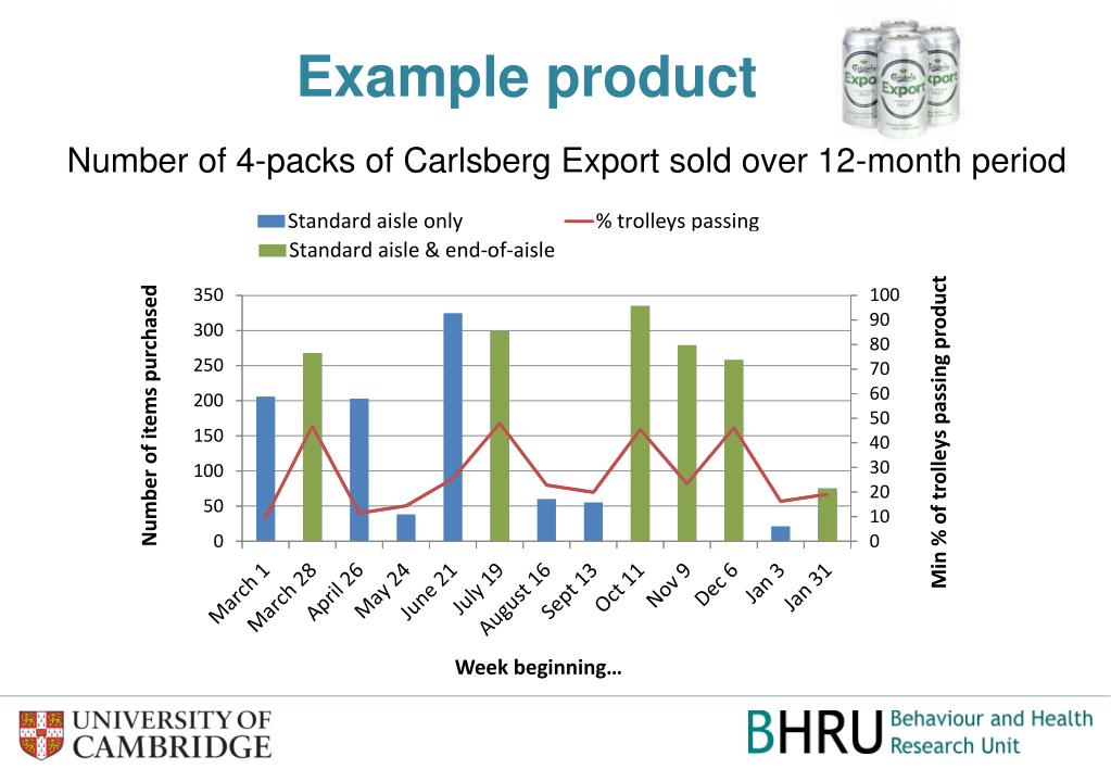 ii) Sales impact of end-of-aisle promotions Study aim: • To estimate the effect of end-of-aisle display on item-level sales of alcohol, controlling for price, price promotion and the number of display locations for each product NB Example of a choice architecture intervention to detrimentally alter health behaviour Methods • A proportion of trolleys are tracked around a map of one UK store and purchases recorded (Nakamura et al (2014), Social Science & Medicine)