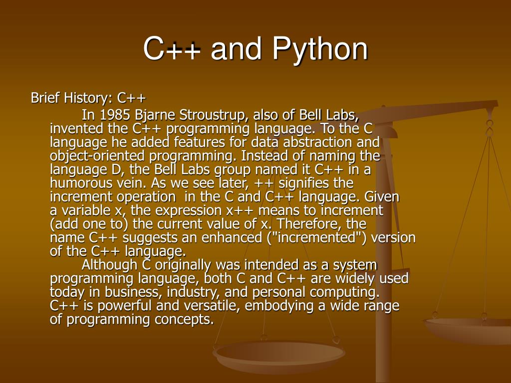 C++ and Python Brief History: C++ In 1985 Bjarne Stroustrup, also of Bell Labs,invented the C++ programming language. To the Clanguage he added features for data abstraction andobject-oriented programming. Instead of naming thelanguage D, the Bell Labs group named it C++ in ahumorous vein. As we see later, ++ signifies theincrement operation in the C and C++ language. Givena variable x, the expression x++ means to increment(add one to) the current value of x. Therefore, thename C++ suggests an enhanced ("incremented") versionof the C++ language. Although C originally was intended as a systemprogramming language, both C and C++ are widely usedtoday in business, industry, and personal computing.C++ is powerful and versatile, embodying a wide rangeof programming concepts.
