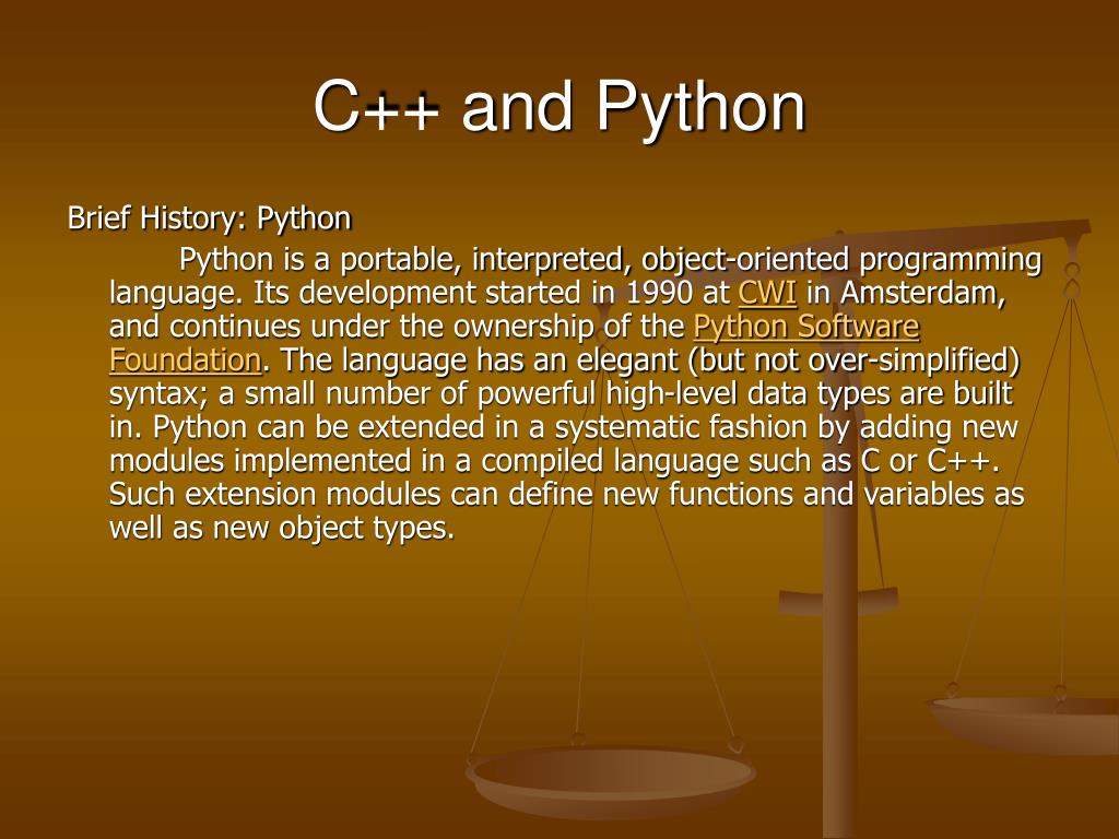 C++ and Python Brief History: Python Python is a portable, interpreted, object-oriented programming language. Its development started in 1990 at CWI in Amsterdam, and continues under the ownership of the Python Software Foundation. The language has an elegant (but not over-simplified) syntax; a small number of powerful high-level data types are built in. Python can be extended in a systematic fashion by adding new modules implemented in a compiled language such as C or C++. Such extension modules can define new functions and variables as well as new object types.