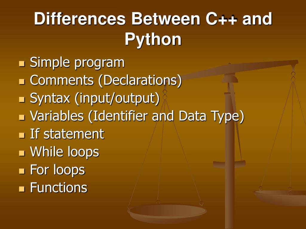 Differences Between C++ and Python • Simple program • Comments (Declarations) • Syntax (input/output) • Variables (Identifier and Data Type) • If statement • While loops • For loops • Functions