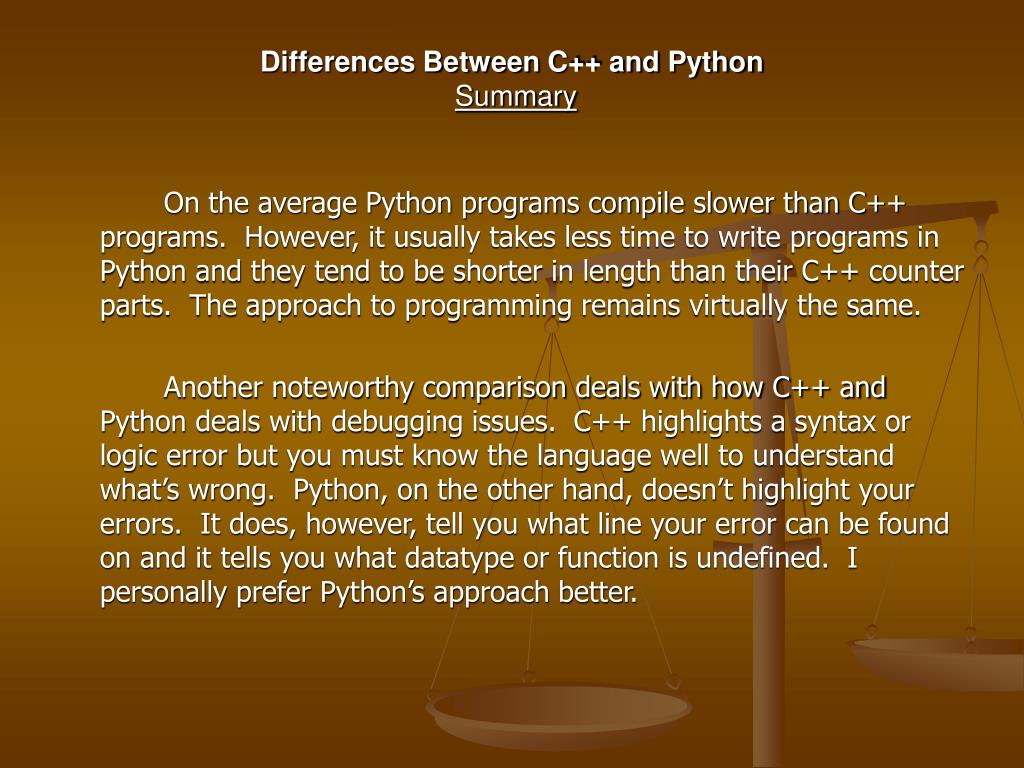 Differences Between C++ and PythonSummary On the average Python programs compile slower than C++ programs. However, it usually takes less time to write programs in Python and they tend to be shorter in length than their C++ counter parts. The approach to programming remains virtually the same. Another noteworthy comparison deals with how C++ and Python deals with debugging issues. C++ highlights a syntax or logic error but you must know the language well to understand what’s wrong. Python, on the other hand, doesn’t highlight your errors. It does, however, tell you what line your error can be found on and it tells you what datatype or function is undefined. I personally prefer Python’s approach better.