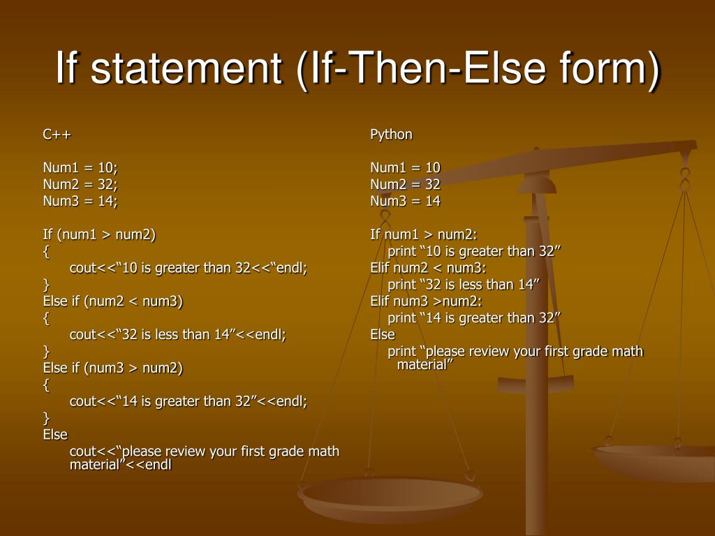 C++ Num1 = 10; Num2 = 32; Num3 = 14; If (num1 > num2) { cout<<“10 is greater than 32<<“endl; } Else if (num2 < num3) { cout<<“32 is less than 14”<<endl; } Else if (num3 > num2) { cout<<“14 is greater than 32”<<endl; } Else cout<<“please review your first grade math material”<<endl Python Num1 = 10 Num2 = 32 Num3 = 14 If num1 > num2: print “10 is greater than 32” Elif num2 < num3: print “32 is less than 14” Elif num3 >num2: print “14 is greater than 32” Else print “please review your first grade math material” If statement (If-Then-Else form)