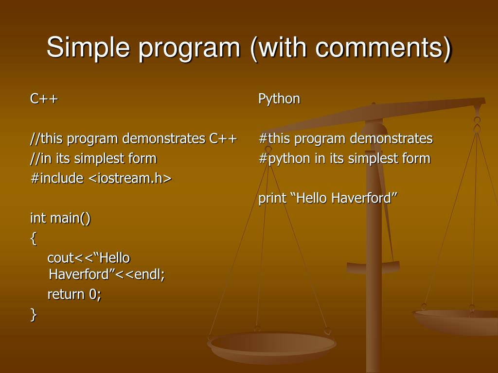 C++ //this program demonstrates C++ //in its simplest form #include <iostream.h> int main() { cout<<“Hello Haverford”<<endl; return 0; } Python #this program demonstrates #python in its simplest form print “Hello Haverford” Simple program (with comments)
