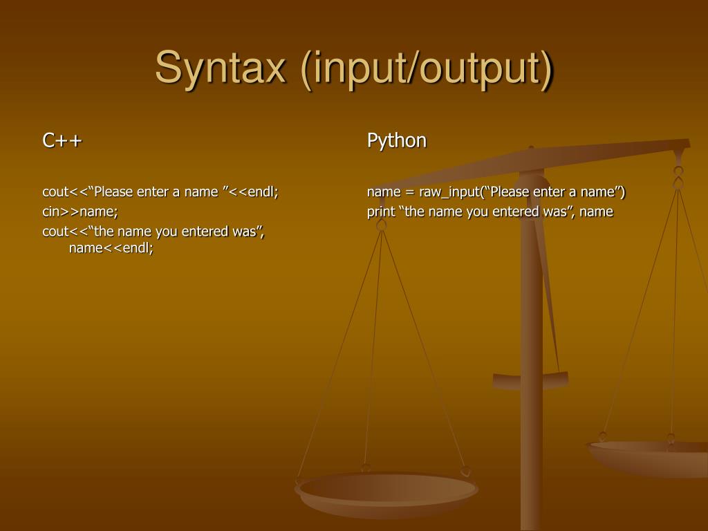 C++ cout<<“Please enter a name ”<<endl; cin>>name; cout<<“the name you entered was”, name<<endl; Python name = raw_input(“Please enter a name”) print “the name you entered was”, name Syntax (input/output)