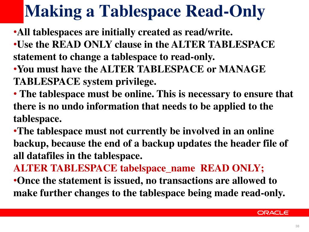 Making a Tablespace Read-Only • All tablespaces are initially created as read/write. • Use the READ ONLY clause in the ALTER TABLESPACE statement to change a tablespace to read-only. • You must have the ALTER TABLESPACE or MANAGE TABLESPACE system privilege. • The tablespace must be online. This is necessary to ensure that there is no undo information that needs to be applied to the tablespace. • The tablespace must not currently be involved in an online backup, because the end of a backup updates the header file of all datafiles in the tablespace. • ALTER TABLESPACE tabelspace_name READ ONLY; • Once the statement is issued, no transactions are allowed to make further changes to the tablespace being made read-only.