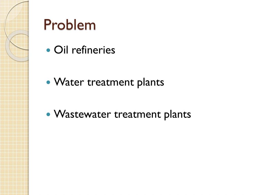 Problem • Oil refineries • Water treatment plants • Wastewater treatment plants