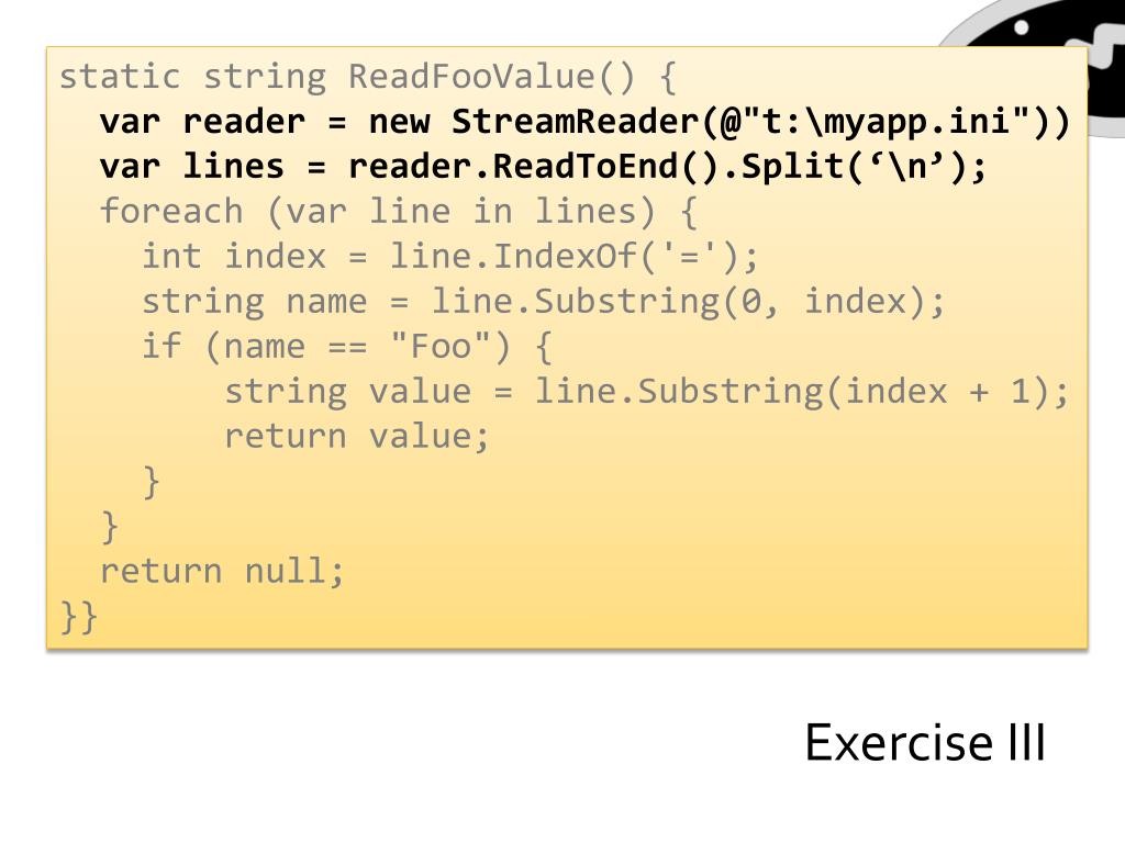 Exercise II static string ReadFooValue() { var reader = new StreamReader(@"t:\myapp.ini"))var lines = reader.ReadToEnd().Split(‘\n’); foreach(var line in lines){ intindex = line.IndexOf('='); string name = line.Substring(0, index); if (name == "Foo") { string value = line.Substring(index + 1); return value; } } return null; }} Exercise III