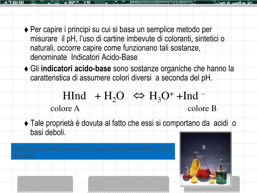 Per capire i principi su cui si basa un semplice metodo per misurare il pH, l’uso di cartine imbevute di coloranti, sintetici o naturali, occorre capire come funzionano tali sostanze, denominate Indicatori Acido-Base • Gli indicatori acido-base sono sostanze organiche che hanno la caratteristica di assumere colori diversi a seconda del pH. • Tale proprietà è dovuta al fatto che essi si comportano da acidi o basi deboli. HInd + H2O ⇔ H3O+ +Ind – colore A colore B https://www.youtube.com/watch?feature=player_embedded&v=2gJ0Xp-Rbn8