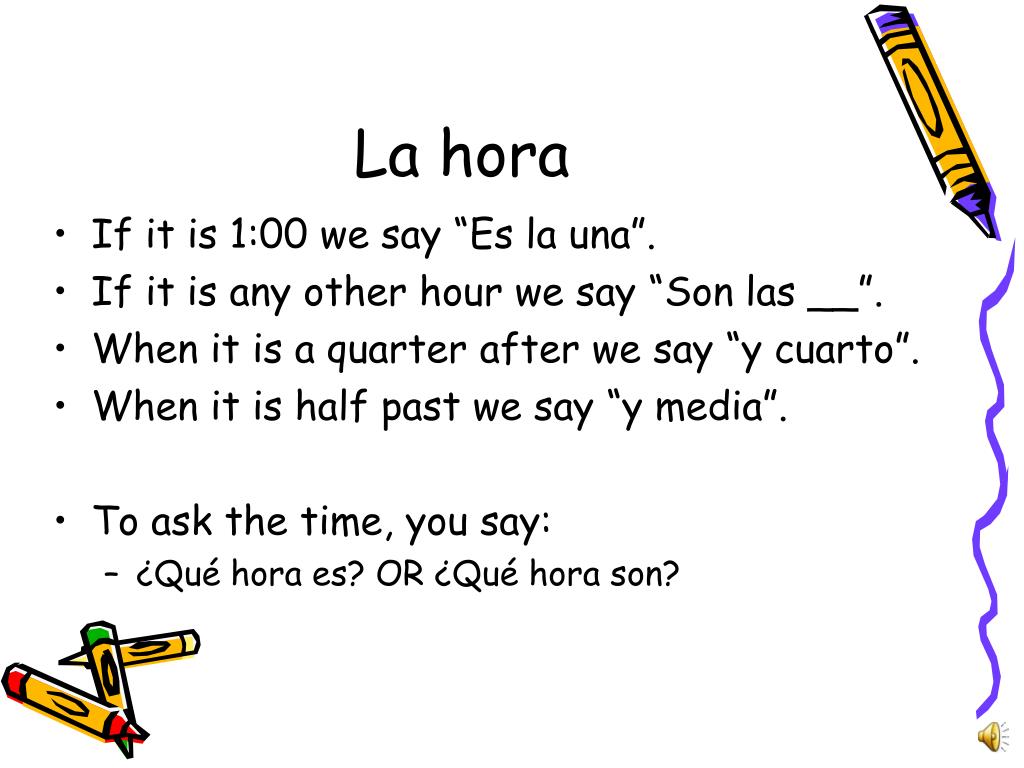 La hora • If it is 1:00 we say “Es la una”. • If it is any other hour we say “Son las __”. • When it is a quarter after we say “y cuarto”. • When it is half past we say “y media”. • To ask the time, you say: • ¿Qué hora es? OR ¿Qué hora son?
