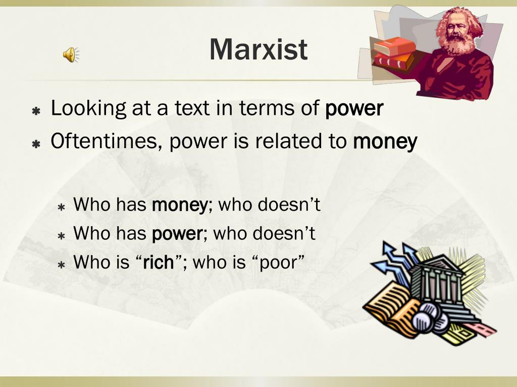 Looking at a text in terms of power Oftentimes, power is related to money Who has money; who doesn’t Who has power; who doesn’t Who is “rich”; who is “poor” Marxist