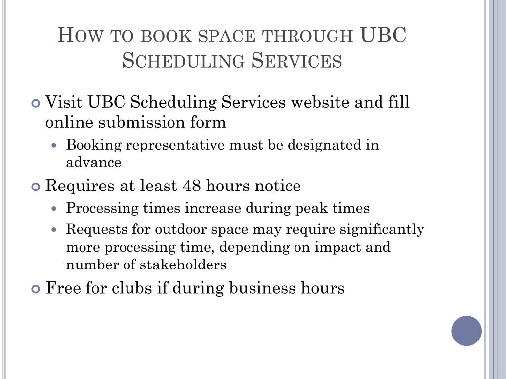 How to book space through UBC Scheduling Services • Visit UBC Scheduling Services website and fill online submission form • Booking representative must be designated in advance • Requires at least 48 hours notice • Processing times increase during peak times • Requests for outdoor space may require significantly more processing time, depending on impact and number of stakeholders • Free for clubs if during business hours