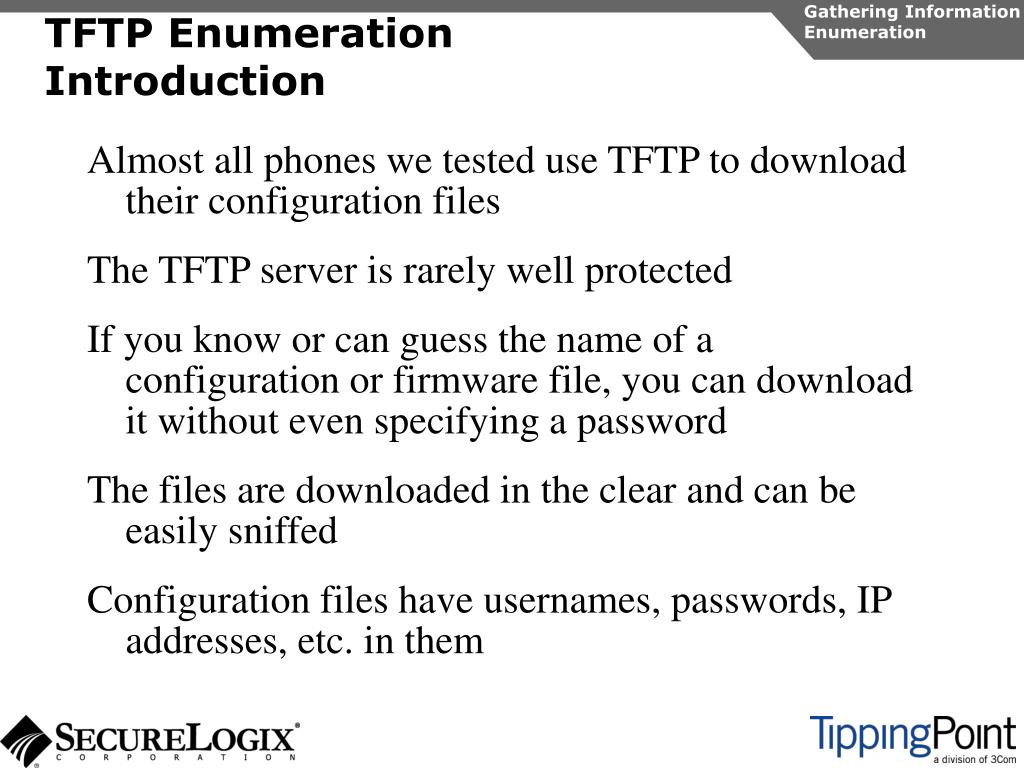 Gathering InformationEnumeration TFTP EnumerationIntroduction Almost all phones we tested use TFTP to download their configuration files The TFTP server is rarely well protected If you know or can guess the name of a configuration or firmware file, you can download it without even specifying a password The files are downloaded in the clear and can be easily sniffed Configuration files have usernames, passwords, IP addresses, etc. in them