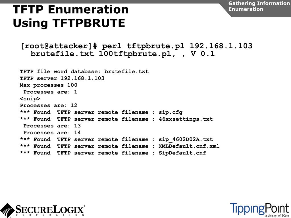 Gathering InformationEnumeration TFTP EnumerationUsing TFTPBRUTE [root@attacker]# perl tftpbrute.pl 192.168.1.103 brutefile.txt 100tftpbrute.pl, , V 0.1 TFTP file word database: brutefile.txt TFTP server 192.168.1.103 Max processes 100 Processes are: 1 <snip> Processes are: 12 *** Found TFTP server remote filename : sip.cfg *** Found TFTP server remote filename : 46xxsettings.txt Processes are: 13 Processes are: 14 *** Found TFTP server remote filename : sip_4602D02A.txt *** Found TFTP server remote filename : XMLDefault.cnf.xml *** Found TFTP server remote filename : SipDefault.cnf