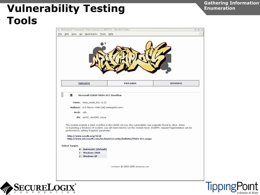 Gathering InformationEnumeration Vulnerability TestingCountermeasures The best solution is to upgrade your applications and make sure you continually apply patches Some firewalls and IPSs can detect and mitigate vulnerability scans