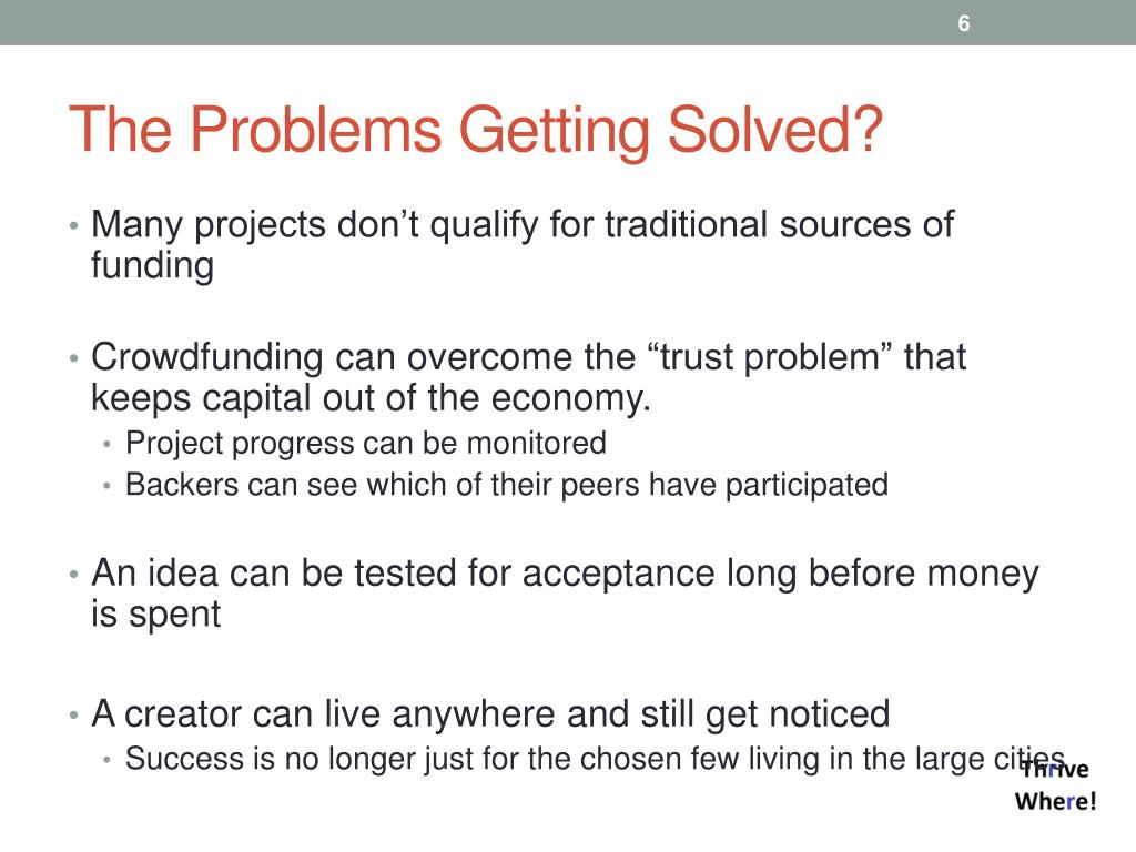 The Problems Getting Solved? • Many projects don’t qualify for traditional sources of funding • Crowdfunding can overcome the “trust problem” that keeps capital out of the economy. • Project progress can be monitored • Backers can see which of their peers have participated • An idea can be tested for acceptance long before money is spent • A creator can live anywhere and still get noticed • Success is no longer just for the chosen few living in the large cities