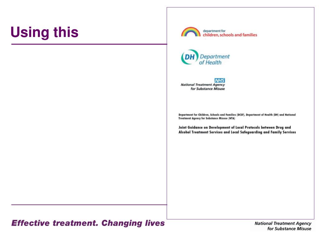 What’s the NTA doing • Working with social work reps and relevant the Government departments to "promote sustained improvement in education and training on alcohol and other drug issues for social work practitioners and managers". • Working with SCIE on e-learning modules on Parental Substance Misuse for Social Workers • Developing supplementary guidance on the Safeguarding/treatment protocols, including and an example protocol and examples of good practice • Recently supported the publication of: