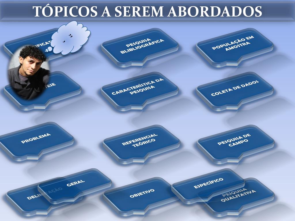 TÓPICOS A SEREM ABORDADOS ,, , JUSTIFICATIVA POPULAÇÃO EM AMOSTRA PESQUISA BLIBLIOGRÁFICA HIPÓTESE CARACTERÍSTICA DA PESQUISA COLETA DE DADOS PROBLEMA REFERENCIAL TEÓRICO PESQUISA DE CAMPO GERAL ESPECÍFICO DELIMITAÇÃO OBJETIVO PESQUISA QUALITATIVA