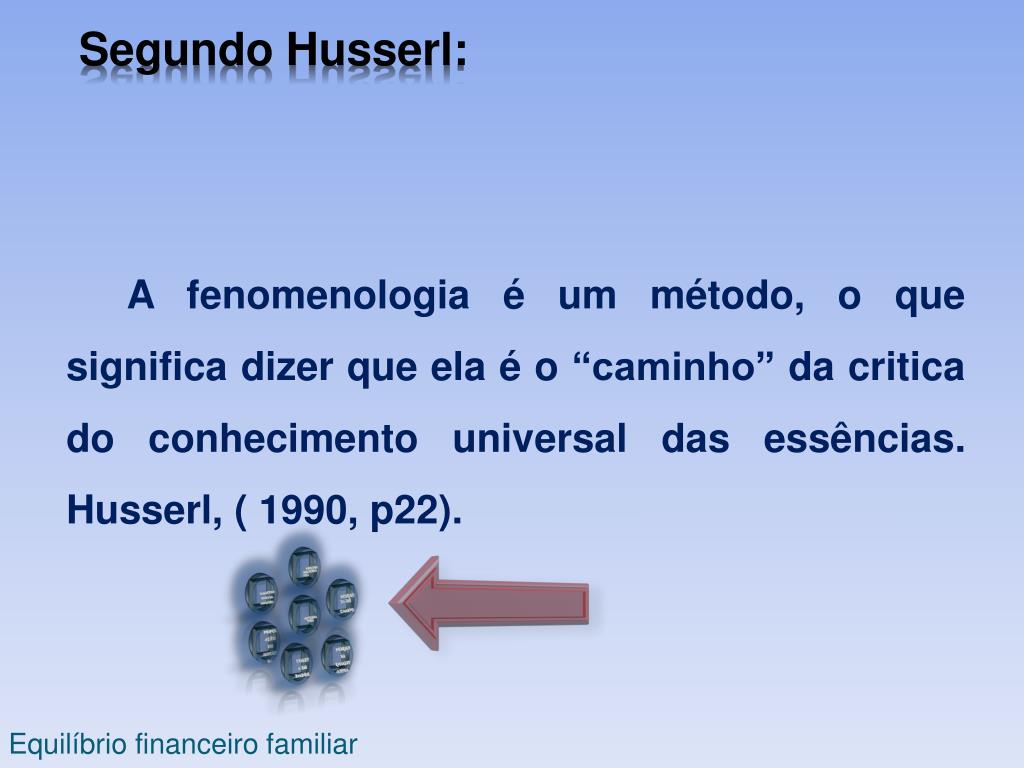 Segundo Husserl: • CARACTERISTICA DA PESQUISA • PESQUISA QUALITATIVA • PESQUISA DE • CAMPO • PESQUISA BIBLIOGRÁFICA • POPULAÇÃO EM AMOSTRA • COLETA DE DADOS • A fenomenologia é um método, o que significa dizer que ela é o “caminho” da critica do conhecimento universal das essências. Husserl, ( 1990, p22). • METODOLOGIA Equilíbrio financeiro familiar