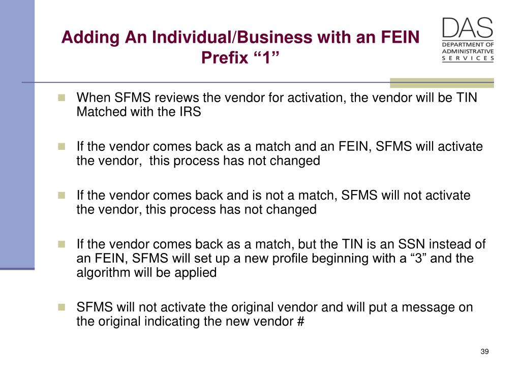 Adding An Individual/Business with an FEINPrefix “1” • When SFMS reviews the vendor for activation, the vendor will be TIN Matched with the IRS • If the vendor comes back as a match and an FEIN, SFMS will activate the vendor, this process has not changed • If the vendor comes back and is not a match, SFMS will not activate the vendor, this process has not changed • If the vendor comes back as a match, but the TIN is an SSN instead of an FEIN, SFMS will set up a new profile beginning with a “3” and the algorithm will be applied • SFMS will not activate the original vendor and will put a message on the original indicating the new vendor #