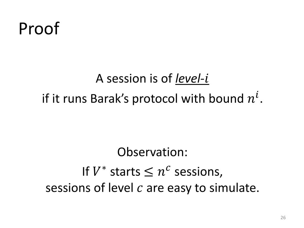 Proof A session is of level- if it runs Barak’s protocol with bound . Observation: If starts sessions, sessions of level are easy to simulate.