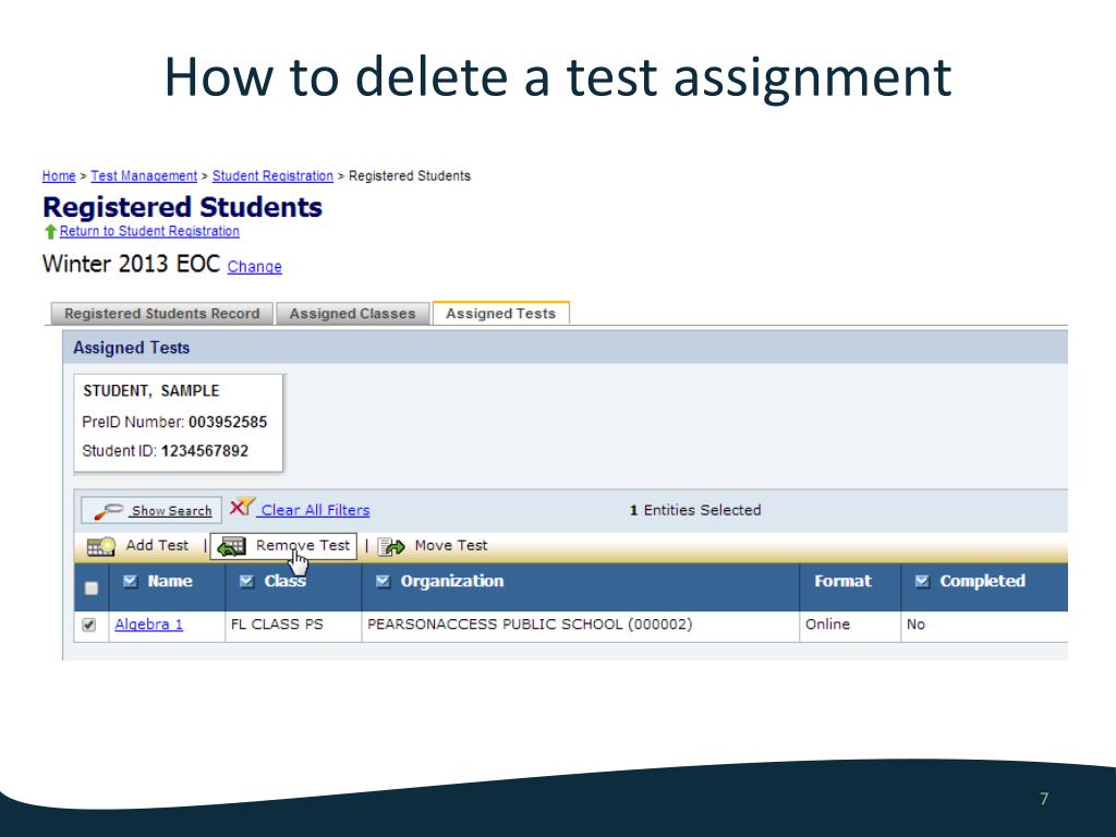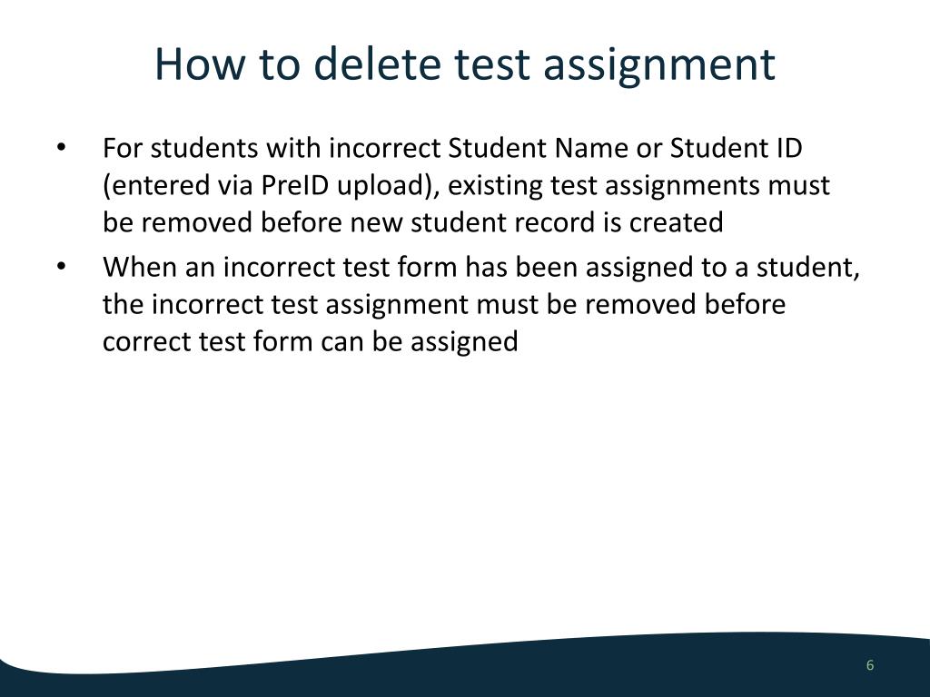 How to delete test assignment • For students with incorrect Student Name or Student ID (entered via PreIDupload), existing test assignments must be removed before new student record is created • When an incorrect test form has been assigned to a student, the incorrect test assignment must be removed before correct test form can be assigned