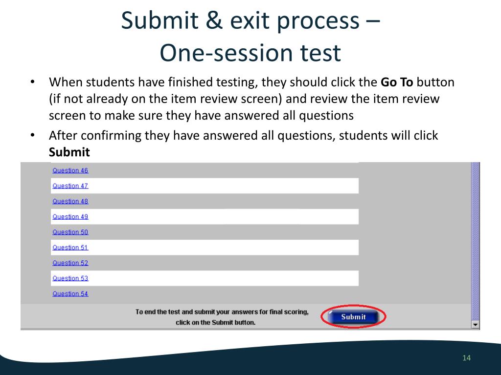 Submit & exit process – One-session test • When students have finished testing, they should click the Go To button (if not already on the item review screen) and review the item review screen to make sure they have answered all questions • After confirming they have answered all questions, students will click Submit