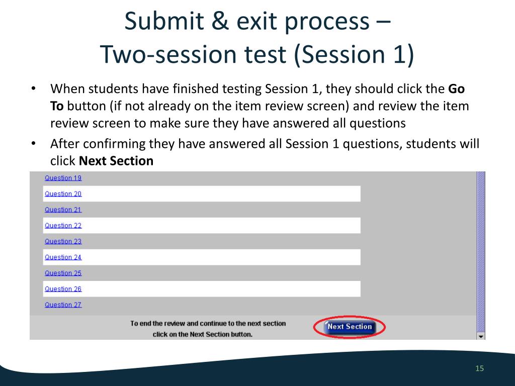 Submit & exit process – Two-session test (Session 1) • When students have finished testing Session 1, they should click the Go To button (if not already on the item review screen) and review the item review screen to make sure they have answered all questions • After confirming they have answered all Session 1 questions, students will click Next Section