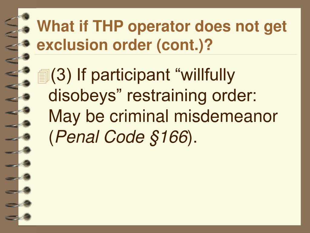 What if THP operator does not get exclusion order (cont.)? • (3) If participant “willfully disobeys” restraining order: May be criminal misdemeanor (Penal Code §166).