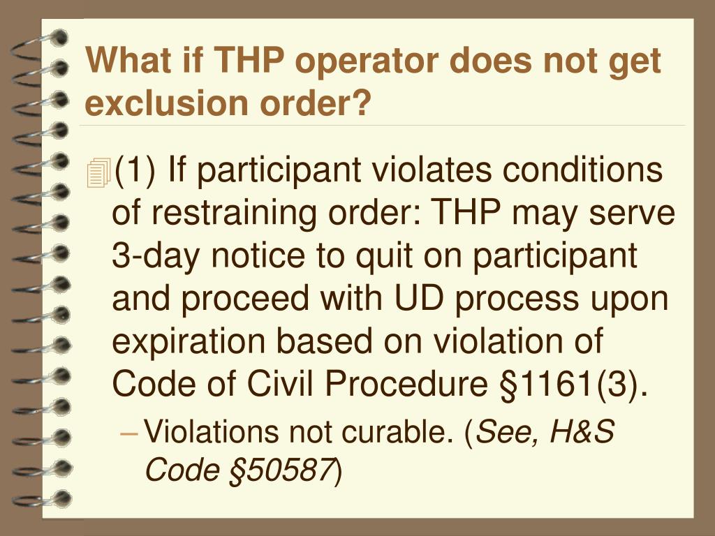 What if THP operator does not get exclusion order? • (1) If participant violates conditions of restraining order: THP may serve 3-day notice to quit on participant and proceed with UD process upon expiration based on violation of Code of Civil Procedure §1161(3). • Violations not curable. (See, H&S Code §50587)