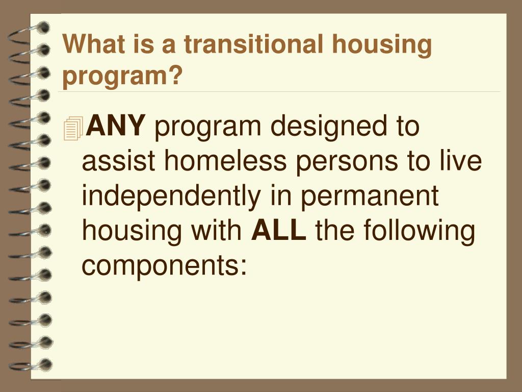 What is a transitional housing program? • ANY program designed to assist homeless persons to live independently in permanent housing with ALL the following components: