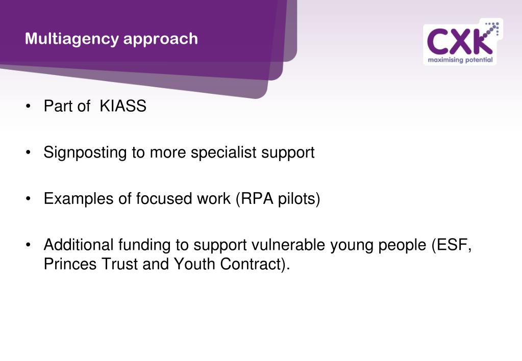 Multiagency approach • Part of KIASS • Signposting to more specialist support • Examples of focused work (RPA pilots) • Additional funding to support vulnerable young people (ESF, Princes Trust and Youth Contract).