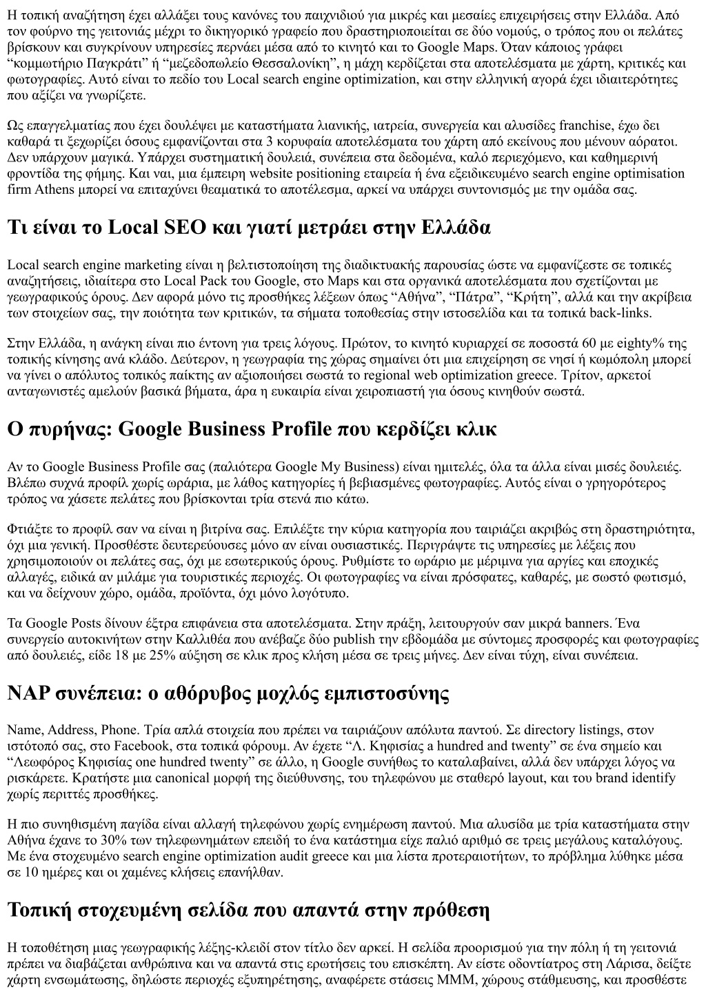 Η τοπική αναζήτηση έχει αλλάξει τους κανόνες του παιχνιδιού για μικρές και μεσαίες επιχειρήσεις στην Ελλάδα. Από τον φούρνο της γειτονιάς μέχρι το δικηγορικό γραφείο που δραστηριοποιείται σε δύο νομούς, ο τρόπος που οι πελάτες βρίσκουν και συγκρίνουν υπηρεσίες περνάει μέσα από το κινητό και το Google Maps. Όταν κάποιος γράφει “κομμωτήριο Παγκράτι” ή “μεζεδοπωλείο Θεσσαλονίκη”, η μάχη κερδίζεται στα αποτελέσματα με χάρτη, κριτικές και φωτογραφίες. Αυτό είναι το πεδίο του Local search engine optimization, και στην ελληνική αγορά έχει ιδιαιτερότητες που αξίζει να γνωρίζετε. Ως επαγγελματίας που έχει δουλέψει με καταστήματα λιανικής, ιατρεία, συνεργεία και αλυσίδες franchise, έχω δει καθαρά τι ξεχωρίζει όσους εμφανίζονται στα 3 κορυφαία αποτελέσματα του χάρτη από εκείνους που μένουν αόρατοι. Δεν υπάρχουν μαγικά. Υπάρχει συστηματική δουλειά, συνέπεια στα δεδομένα, καλό περιεχόμενο, και καθημερινή φροντίδα της φήμης. Και ναι, μια έμπειρη website positioning εταιρεία ή ένα εξειδικευμένο search engine optimisation firm Athens μπορεί να επιταχύνει θεαματικά το αποτέλεσμα, αρκεί να υπάρχει συντονισμός με την ομάδα σας. Τι είναι το Local SEO και γιατί μετράει στην Ελλάδα Local search engine marketing είναι η βελτιστοποίηση της διαδικτυακής παρουσίας ώστε να εμφανίζεστε σε τοπικές αναζητήσεις, ιδιαίτερα στο Local Pack του Google, στο Maps και στα οργανικά αποτελέσματα που σχετίζονται με γεωγραφικούς όρους. Δεν αφορά μόνο τις προσθήκες λέξεων όπως “Αθήνα”, “Πάτρα”, “Κρήτη”, αλλά και την ακρίβεια των στοιχείων σας, την ποιότητα των κριτικών, τα σήματα τοποθεσίας στην ιστοσελίδα και τα τοπικά back-links. Στην Ελλάδα, η ανάγκη είναι πιο έντονη για τρεις λόγους. Πρώτον, το κινητό κυριαρχεί σε ποσοστά 60 με eighty% της τοπικής κίνησης ανά κλάδο. Δεύτερον, η γεωγραφία της χώρας σημαίνει ότι μια επιχείρηση σε νησί ή κωμόπολη μπορεί να γίνει ο απόλυτος τοπικός παίκτης αν αξιοποιήσει σωστά το regional web optimization greece. Τρίτον, αρκετοί ανταγωνιστές αμελούν βασικά βήματα, άρα η ευκαιρία είναι χειροπιαστή για όσους κινηθούν σωστά. Ο πυρήνας: Google Business Profile που κερδίζει κλικ Αν το Google Business Profile σας (παλιότερα Google My Business) είναι ημιτελές, όλα τα άλλα είναι μισές δουλειές. Βλέπω συχνά προφίλ χωρίς ωράρια, με λάθος κατηγορίες ή βεβιασμένες φωτογραφίες. Αυτός είναι ο γρηγορότερος τρόπος να χάσετε πελάτες που βρίσκονται τρία στενά πιο κάτω. Φτιάξτε το προφίλ σαν να είναι η βιτρίνα σας. Επιλέξτε την κύρια κατηγορία που ταιριάζει ακριβώς στη δραστηριότητα, όχι μια γενική. Προσθέστε δευτερεύουσες μόνο αν είναι ουσιαστικές. Περιγράψτε τις υπηρεσίες με λέξεις που χρησιμοποιούν οι πελάτες σας, όχι με εσωτερικούς όρους. Ρυθμίστε το ωράριο με μέριμνα για αργίες και εποχικές αλλαγές, ειδικά αν μιλάμε για τουριστικές περιοχές. Οι φωτογραφίες να είναι πρόσφατες, καθαρές, με σωστό φωτισμό, και να δείχνουν χώρο, ομάδα, προϊόντα, όχι μόνο λογότυπο. Τα Google Posts δίνουν έξτρα επιφάνεια στα αποτελέσματα. Στην πράξη, λειτουργούν σαν μικρά banners. Ένα συνεργείο αυτοκινήτων στην Καλλιθέα που ανέβαζε δύο publish την εβδομάδα με σύντομες προσφορές και φωτογραφίες από δουλειές, είδε 18 με 25% αύξηση σε κλικ προς κλήση μέσα σε τρεις μήνες. Δεν είναι τύχη, είναι συνέπεια. NAP συνέπεια: ο αθόρυβος μοχλός εμπιστοσύνης Name, Address, Phone. Τρία απλά στοιχεία που πρέπει να ταιριάζουν απόλυτα παντού. Σε directory listings, στον ιστότοπό σας, στο Facebook, στα τοπικά φόρουμ. Αν έχετε “Λ. Κηφισίας a hundred and twenty” σε ένα σ