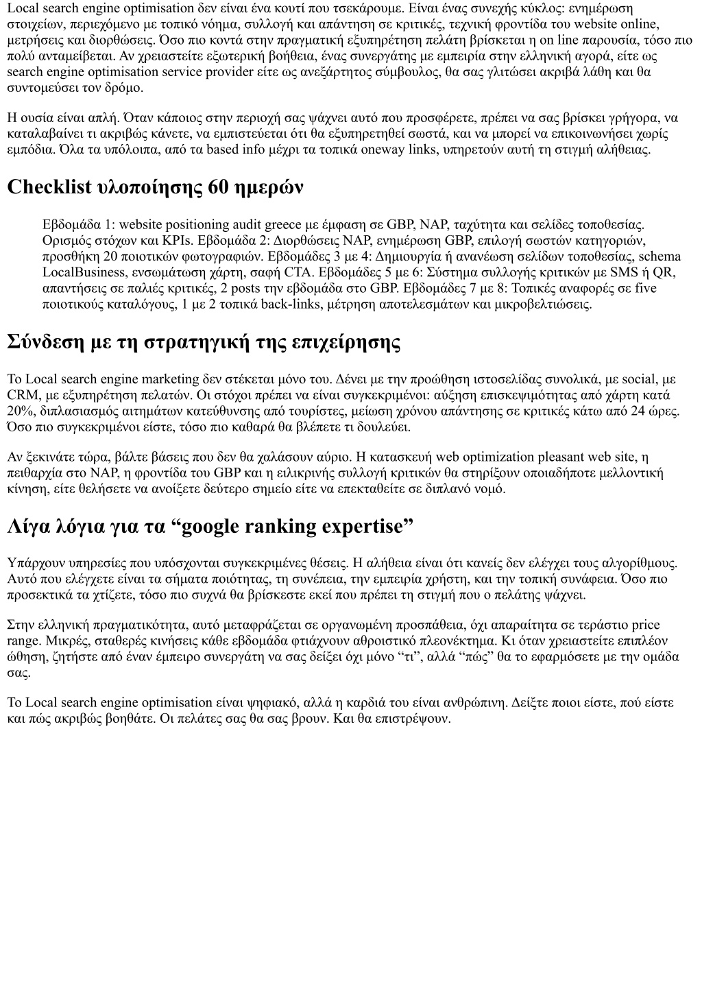 Local search engine optimisation δεν είναι ένα κουτί που τσεκάρουμε. Είναι ένας συνεχής κύκλος: ενημέρωση στοιχείων, περιεχόμενο με τοπικό νόημα, συλλογή και απάντηση σε κριτικές, τεχνική φροντίδα του website online, μετρήσεις και διορθώσεις. Όσο πιο κοντά στην πραγματική εξυπηρέτηση πελάτη βρίσκεται η on line παρουσία, τόσο πιο πολύ ανταμείβεται. Αν χρειαστείτε εξωτερική βοήθεια, ένας συνεργάτης με εμπειρία στην ελληνική αγορά, είτε ως search engine optimisation service provider είτε ως ανεξάρτητος σύμβουλος, θα σας γλιτώσει ακριβά λάθη και θα συντομεύσει τον δρόμο. Η ουσία είναι απλή. Όταν κάποιος στην περιοχή σας ψάχνει αυτό που προσφέρετε, πρέπει να σας βρίσκει γρήγορα, να καταλαβαίνει τι ακριβώς κάνετε, να εμπιστεύεται ότι θα εξυπηρετηθεί σωστά, και να μπορεί να επικοινωνήσει χωρίς εμπόδια. Όλα τα υπόλοιπα, από τα based info μέχρι τα τοπικά oneway links, υπηρετούν αυτή τη στιγμή αλήθειας. Checklist υλοποίησης 60 ημερών Εβδομάδα 1: website positioning audit greece με έμφαση σε GBP, NAP, ταχύτητα και σελίδες τοποθεσίας. Ορισμός στόχων και KPIs. Εβδομάδα 2: Διορθώσεις NAP, ενημέρωση GBP, επιλογή σωστών κατηγοριών, προσθήκη 20 ποιοτικών φωτογραφιών. Εβδομάδες 3 με 4: Δημιουργία ή ανανέωση σελίδων τοποθεσίας, schema LocalBusiness, ενσωμάτωση χάρτη, σαφή CTA. Εβδομάδες 5 με 6: Σύστημα συλλογής κριτικών με SMS ή QR, απαντήσεις σε παλιές κριτικές, 2 posts την εβδομάδα στο GBP. Εβδομάδες 7 με 8: Τοπικές αναφορές σε five ποιοτικούς καταλόγους, 1 με 2 τοπικά back-links, μέτρηση αποτελεσμάτων και μικροβελτιώσεις. Σύνδεση με τη στρατηγική της επιχείρησης Το Local search engine marketing δεν στέκεται μόνο του. Δένει με την προώθηση ιστοσελίδας συνολικά, με social, με CRM, με εξυπηρέτηση πελατών. Οι στόχοι πρέπει να είναι συγκεκριμένοι: αύξηση επισκεψιμότητας από χάρτη κατά 20%, διπλασιασμός αιτημάτων κατεύθυνσης από τουρίστες, μείωση χρόνου απάντησης σε κριτικές κάτω από 24 ώρες. Όσο πιο συγκεκριμένοι είστε, τόσο πιο καθαρά θα βλέπετε τι δουλεύει. Αν ξεκινάτε τώρα, βάλτε βάσεις που δεν θα χαλάσουν αύριο. Η κατασκευή web optimization pleasant web site, η πειθαρχία στο NAP, η φροντίδα του GBP και η ειλικρινής συλλογή κριτικών θα στηρίξουν οποιαδήποτε μελλοντική κίνηση, είτε θελήσετε να ανοίξετε δεύτερο σημείο είτε να επεκταθείτε σε διπλανό νομό. Λίγα λόγια για τα “google ranking expertise” Υπάρχουν υπηρεσίες που υπόσχονται συγκεκριμένες θέσεις. Η αλήθεια είναι ότι κανείς δεν ελέγχει τους αλγορίθμους. Αυτό που ελέγχετε είναι τα σήματα ποιότητας, τη συνέπεια, την εμπειρία χρήστη, και την τοπική συνάφεια. Όσο πιο προσεκτικά τα χτίζετε, τόσο πιο συχνά θα βρίσκεστε εκεί που πρέπει τη στιγμή που ο πελάτης ψάχνει. Στην ελληνική πραγματικότητα, αυτό μεταφράζεται σε οργανωμένη προσπάθεια, όχι απαραίτητα σε τεράστιο price range. Μικρές, σταθερές κινήσεις κάθε εβδομάδα φτιάχνουν αθροιστικό πλεονέκτημα. Κι όταν χρειαστείτε επιπλέον ώθηση, ζητήστε από έναν έμπειρο συνεργάτη να σας δείξει όχι μόνο “τι”, αλλά “πώς” θα το εφαρμόσετε με την ομάδα σας. Το Local search engine optimisation είναι ψηφιακό, αλλά η καρδιά του είναι ανθρώπινη. Δείξτε ποιοι είστε, πού είστε και πώς ακριβώς βοηθάτε. Οι πελάτες σας θα σας βρουν. Και θα επιστρέψουν.