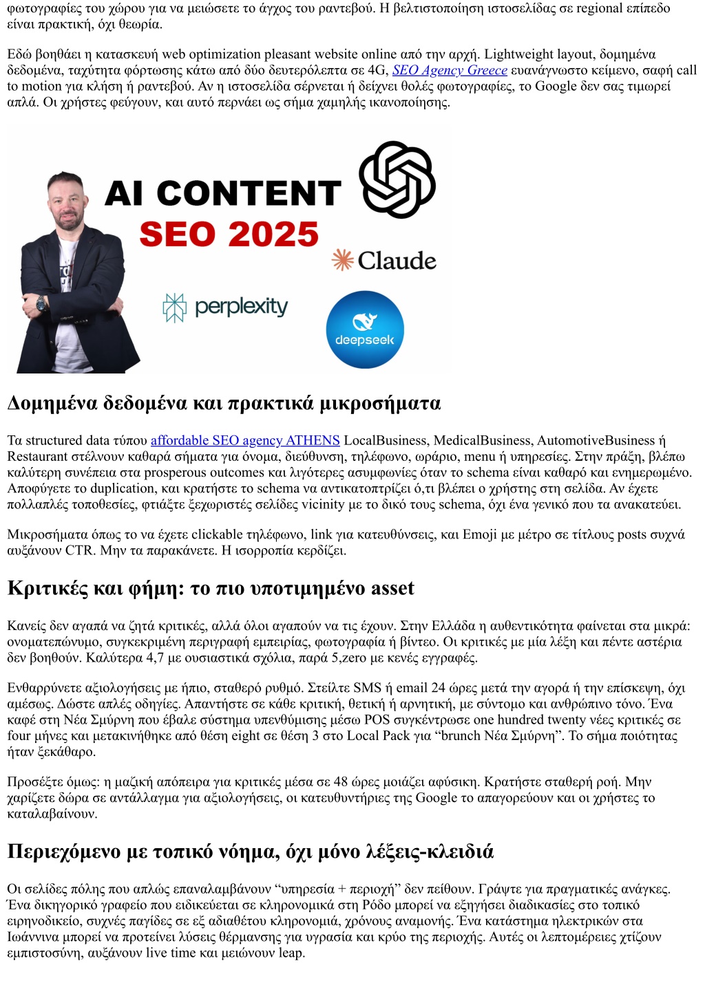 φωτογραφίες του χώρου για να μειώσετε το άγχος του ραντεβού. Η βελτιστοποίηση ιστοσελίδας σε regional επίπεδο είναι πρακτική, όχι θεωρία. Εδώ βοηθάει η κατασκευή web optimization pleasant website online από την αρχή. Lightweight layout, δομημένα δεδομένα, ταχύτητα φόρτωσης κάτω από δύο δευτερόλεπτα σε 4G, SEO Agency Greece ευανάγνωστο κείμενο, σαφή call to motion για κλήση ή ραντεβού. Αν η ιστοσελίδα σέρνεται ή δείχνει θολές φωτογραφίες, το Google δεν σας τιμωρεί απλά. Οι χρήστες φεύγουν, και αυτό περνάει ως σήμα χαμηλής ικανοποίησης. Δομημένα δεδομένα και πρακτικά μικροσήματα Τα structured data τύπου affordable SEO agency ATHENS LocalBusiness, MedicalBusiness, AutomotiveBusiness ή Restaurant στέλνουν καθαρά σήματα για όνομα, διεύθυνση, τηλέφωνο, ωράριο, menu ή υπηρεσίες. Στην πράξη, βλέπω καλύτερη συνέπεια στα prosperous outcomes και λιγότερες ασυμφωνίες όταν το schema είναι καθαρό και ενημερωμένο. Αποφύγετε το duplication, και κρατήστε το schema να αντικατοπτρίζει ό,τι βλέπει ο χρήστης στη σελίδα. Αν έχετε πολλαπλές τοποθεσίες, φτιάξτε ξεχωριστές σελίδες vicinity με το δικό τους schema, όχι ένα γενικό που τα ανακατεύει. Μικροσήματα όπως το να έχετε clickable τηλέφωνο, link για κατευθύνσεις, και Emoji με μέτρο σε τίτλους posts συχνά αυξάνουν CTR. Μην τα παρακάνετε. Η ισορροπία κερδίζει. Κριτικές και φήμη: το πιο υποτιμημένο asset Κανείς δεν αγαπά να ζητά κριτικές, αλλά όλοι αγαπούν να τις έχουν. Στην Ελλάδα η αυθεντικότητα φαίνεται στα μικρά: ονοματεπώνυμο, συγκεκριμένη περιγραφή εμπειρίας, φωτογραφία ή βίντεο. Οι κριτικές με μία λέξη και πέντε αστέρια δεν βοηθούν. Καλύτερα 4,7 με ουσιαστικά σχόλια, παρά 5,zero με κενές εγγραφές. Ενθαρρύνετε αξιολογήσεις με ήπιο, σταθερό ρυθμό. Στείλτε SMS ή email 24 ώρες μετά την αγορά ή την επίσκεψη, όχι αμέσως. Δώστε απλές οδηγίες. Απαντήστε σε κάθε κριτική, θετική ή αρνητική, με σύντομο και ανθρώπινο τόνο. Ένα καφέ στη Νέα Σμύρνη που έβαλε σύστημα υπενθύμισης μέσω POS συγκέντρωσε one hundred twenty νέες κριτικές σε four μήνες και μετακινήθηκε από θέση eight σε θέση 3 στο Local Pack για “brunch Νέα Σμύρνη”. Το σήμα ποιότητας ήταν ξεκάθαρο. Προσέξτε όμως: η μαζική απόπειρα για κριτικές μέσα σε 48 ώρες μοιάζει αφύσικη. Κρατήστε σταθερή ροή. Μην χαρίζετε δώρα σε αντάλλαγμα για αξιολογήσεις, οι κατευθυντήριες της Google το απαγορεύουν και οι χρήστες το καταλαβαίνουν. Περιεχόμενο με τοπικό νόημα, όχι μόνο λέξεις-κλειδιά Οι σελίδες πόλης που απλώς επαναλαμβάνουν “υπηρεσία + περιοχή” δεν πείθουν. Γράψτε για πραγματικές ανάγκες. Ένα δικηγορικό γραφείο που ειδικεύεται σε κληρονομικά στη Ρόδο μπορεί να εξηγήσει διαδικασίες στο τοπικό ειρηνοδικείο, συχνές παγίδες σε εξ αδιαθέτου κληρονομιά, χρόνους αναμονής. Ένα κατάστημα ηλεκτρικών στα Ιωάννινα μπορεί να προτείνει λύσεις θέρμανσης για υγρασία και κρύο της περιοχής. Αυτές οι λεπτομέρειες χτίζουν εμπιστοσύνη, αυξάνουν live time και μειώνουν leap.