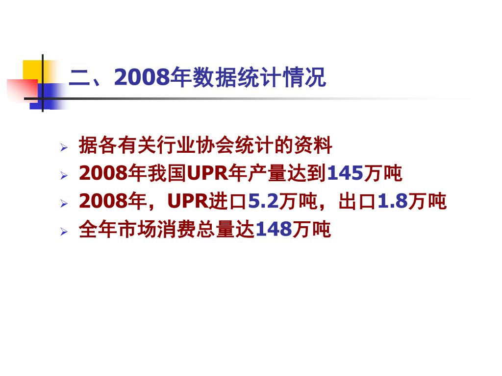 二、2008年数据统计情况 • 据各有关行业协会统计的资料 • 2008年我国UPR年产量达到145万吨 • 2008年,UPR进口5.2万吨,出口1.8万吨 • 全年市场消费总量达148万吨