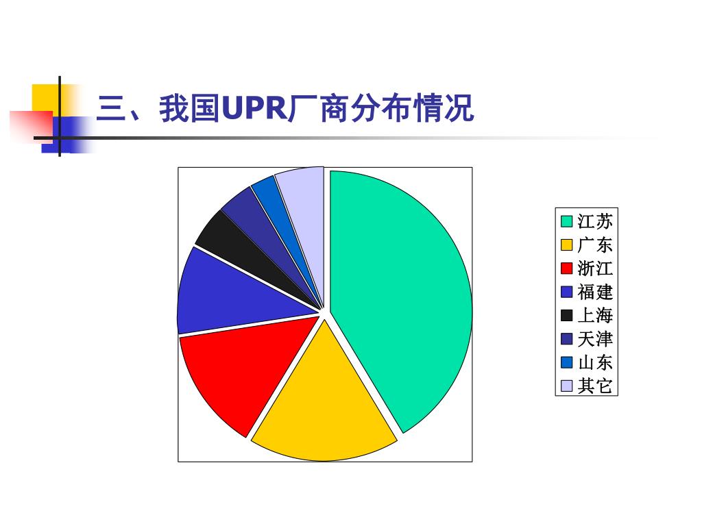 三、我国UPR厂商分布情况 • 长江三角地区: • 代表省市:江苏省、浙江省、上海市 • 珠江三角地区: • 代表省市:广东省、福建省 • 环渤海地区: • 代表省市:天津市、北京市、山东省、河北省 • 我国的UPR产业发展存在不平衡问题,上述省市总产量约占全国总量的96%