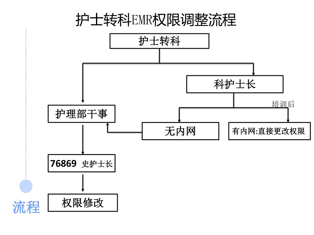 护士转科EMR权限调整流程 护士转科 科护士长 培训后 护理部干事 无内网 有内网:直接更改权限 76869 史护士长 权限修改 流程