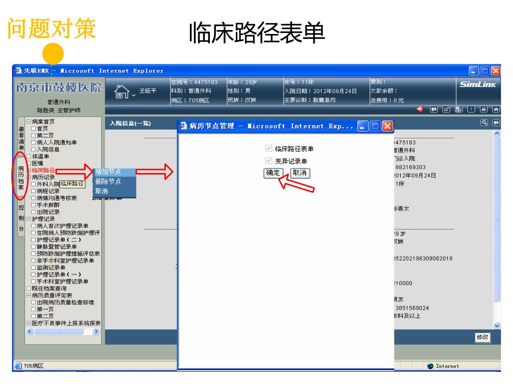 临床路径新需求申报流程 临床科室 科室主任:审核通过临床路径表单“主要诊疗、医嘱”等内容 科室护士长:审核通过表单中“主要护理工作”内容 新病种加入临床路径 医务处 信息科 先联公司 + 完成上线 护理部 临床科室 流程