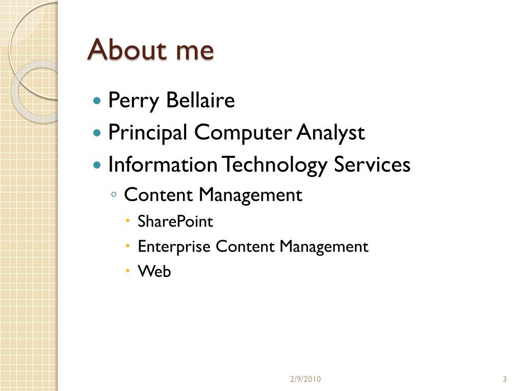About me • Perry Bellaire • Principal Computer Analyst • Information Technology Services • Content Management • SharePoint • Enterprise Content Management • Web