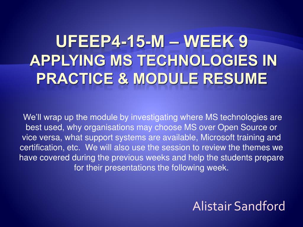 UFEEP4-15-M – Week 9 Applying MS Technologies in Practice & Module Resume We’ll wrap up the module by investigating where MS technologies are best used, why organisations may choose MS over Open Source or vice versa, what support systems are available, Microsoft training and certification, etc. We will also use the session to review the themes we have covered during the previous weeks and help the students prepare for their presentations the following week. Alistair Sandford