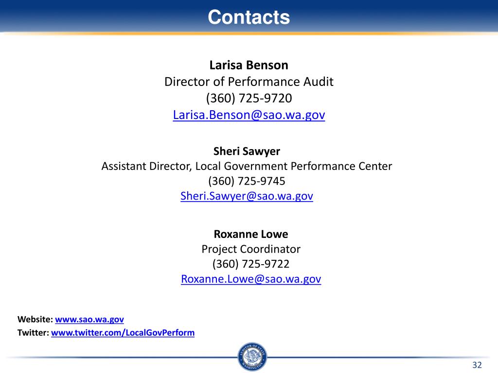Contacts • Larisa Benson • Director of Performance Audit • (360) 725-9720 • Larisa.Benson@sao.wa.gov • Sheri Sawyer • Assistant Director, Local Government Performance Center • (360) 725-9745 • Sheri.Sawyer@sao.wa.gov • Roxanne Lowe • Project Coordinator • (360) 725-9722 • Roxanne.Lowe@sao.wa.gov Website:www.sao.wa.gov Twitter: www.twitter.com/LocalGovPerform