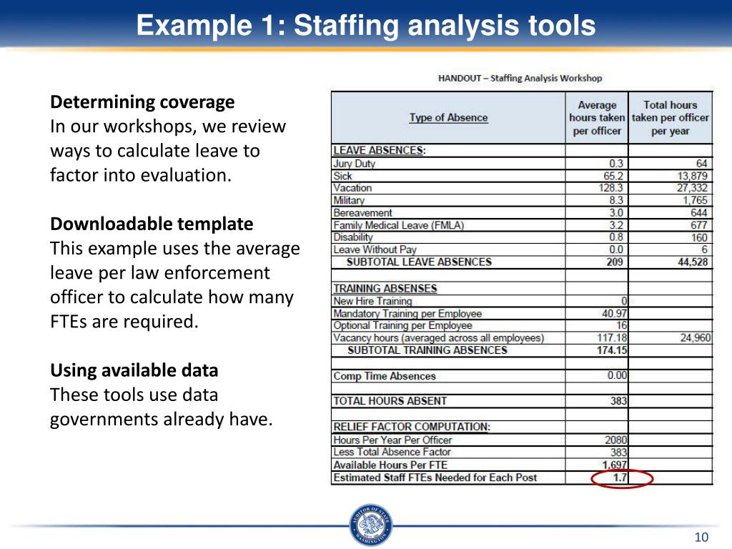 Example 1: Staffing analysis tools • Determining coverage • In our workshops, we review ways to calculate leave to factor into evaluation. • Downloadable template • This example uses the average leave per law enforcement officer to calculate how many FTEs are required. • Using available data • These tools use data governments already have.