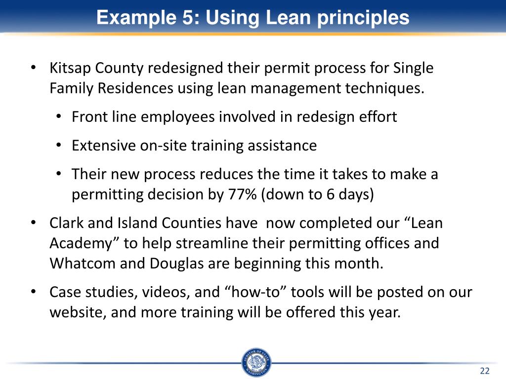 Example 5: Using Lean principles • Kitsap County redesigned their permit process for Single Family Residences using lean management techniques. • Front line employees involved in redesign effort • Extensive on-site training assistance • Their new process reduces the time it takes to make a permitting decision by 77% (down to 6 days) • Clark and Island Counties have now completed our “Lean Academy” to help streamline their permitting offices and Whatcom and Douglas are beginning this month. • Case studies, videos, and “how-to” tools will be posted on our website, and more training will be offered this year.
